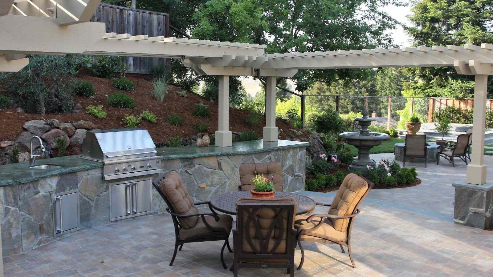 - Your family barbecue is shaded by a beautiful wood pergola defining the space surrounding an outdoor kitchen and dining area.